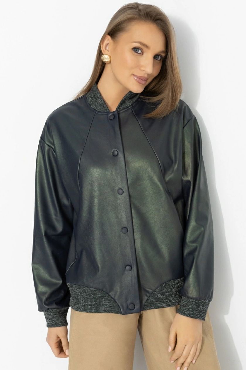 Бомбер зелёный из экокожи от производителя Charutti. Модель свободного кроя, без подклада, по бокам карманы. Застёжка на кнопки. Длинные рукава с манжетами. Идеальный выбор для создания стильного образа.