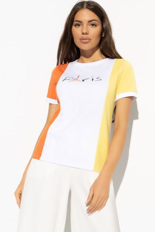 Футболка комбинированная с принтом от компании Charutti. Модель свободного силуэта, выполнена из трикотажного полотна "милано". Округлый вырез горловины. Втачные короткие рукава. Без застёжки. Низ ровный. Идеальный выбор для создания женственного образа.