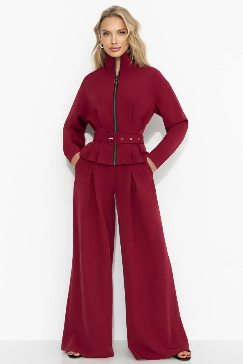 Костюм брючный бордовый спорт-шик от производителя Charutti. Брюки широкие, пояс на резинке, в боковых швах карманы. Жакет с застёжкой на молнию, длинные рукава. Стильный вариант для создания повседневного образа.