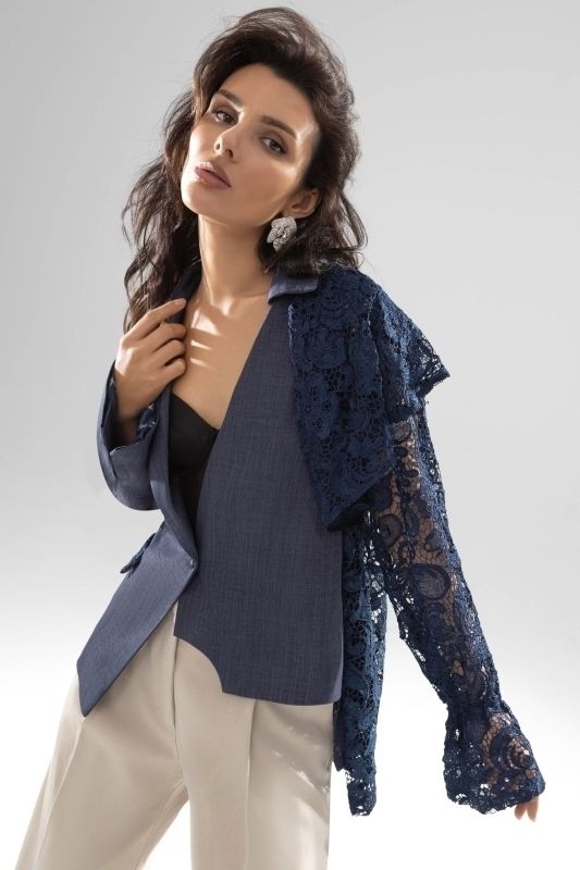 Жакет синий комбинированный с кружевом от компании Charutti. Модель свободного силуэта, V-образный вырез горловины с английским вороником. Втачные длинные рукава, со спущенной линией плеча. Сбоку завязки. Идеальный выбор для создания стильного образа.