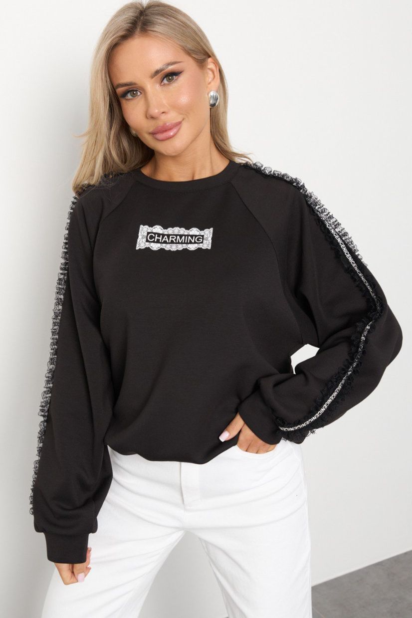 Джемпер трикотажный чёрного цвета от компании Jetty. Модель свободного силуэта, длинный рукав реглан на манжете. По низу изделия вшита кулиска, что позволяет носить джемпер как свободным, так и собрать его на кулиску. Рукав от горловины декорирован лампасами. Стильный образ для повседневной носки.
