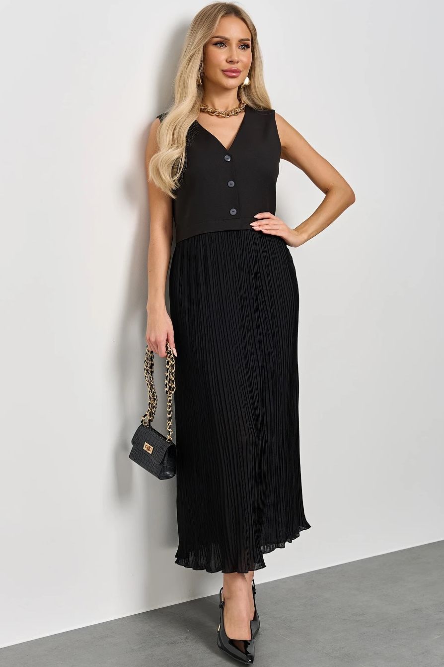 Платье комбинированное чёрного цвета от производителя Jetty. Верх изделия выполнен из костюмной ткани, юбка из жатого шифона с подкладом. Верх платья - имитация жилетки. По переду изделия пуговицы. Стильный вариант для повседневной носки.