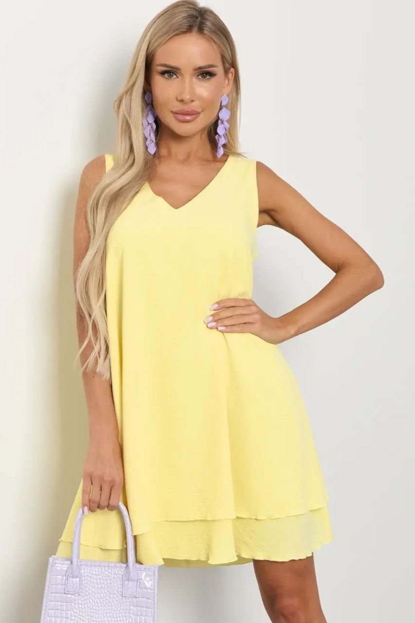 Платье короткое жёлтого цвета от производителя Jetty. Модель свободного силуэта, выполнена из струящейся плательной ткани. Платье полностью двойное. Перед изделия с V-образным вырезом. Идеальный выбор на каждый день.