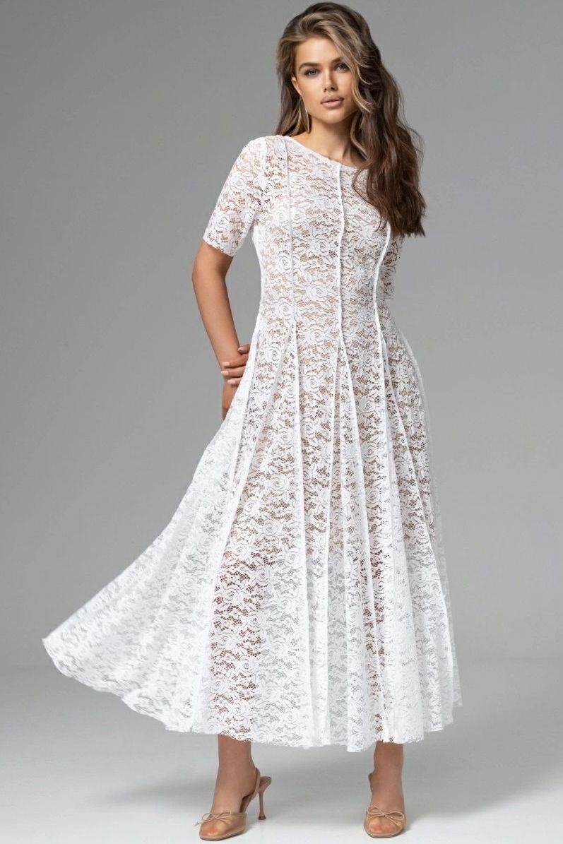 Платье белое из кружева на подкладе от компании Charutti. Модель полуприлегающего силуэта. Кружевная фактура создаёт изящную игру света и тени, а мягкий трикотажный подклад обеспечивает комфортную посадку. Приталенный крой и длина миди формируют вытянутый, элегантный силуэт. Этот образ говорит о вас больше любых слов.
