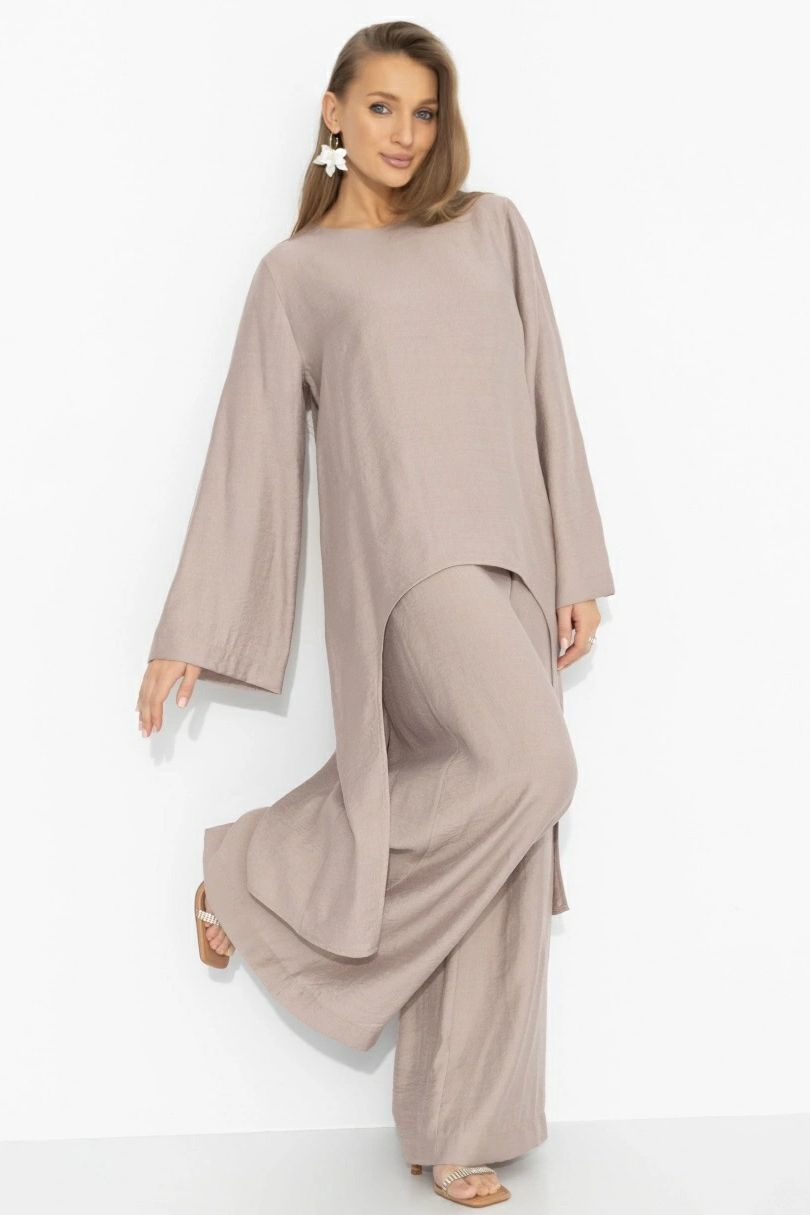 Туника оригинального кроя от компании Charutti. Лёгкая, струящаяся туника с асимметричным подолом создаёт движение и вытягивает фигуру, свободный крой дарит воздух и уверенность. Мягкая ткань красиво драпируется, расклешённый рукав добавляет пластики. В этом образе легко думать о вечном и смело идти за своими целями – величие начинается с комфорта. Миксуйте с джинсами, белыми брюками или дополните комплект брюками из той же ткани.