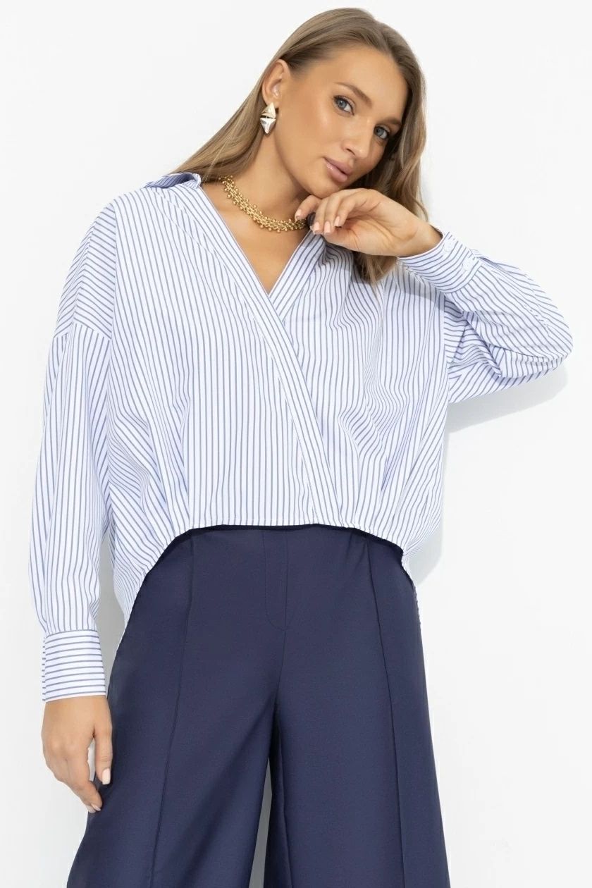 Рубашка в полоску с асимметричным низом от компании Charutti, выполнена из мягкой, воздухопроницаемой рубашечной ткани. Удлиненный по спинке свободный крой с имитацией запаха позволяет регулировать посадку и корректировать нюансы фигуры. Длинные рукава,V-образный вырез горловины. Для тех, кто любит фантазию в базовом гардеробе.