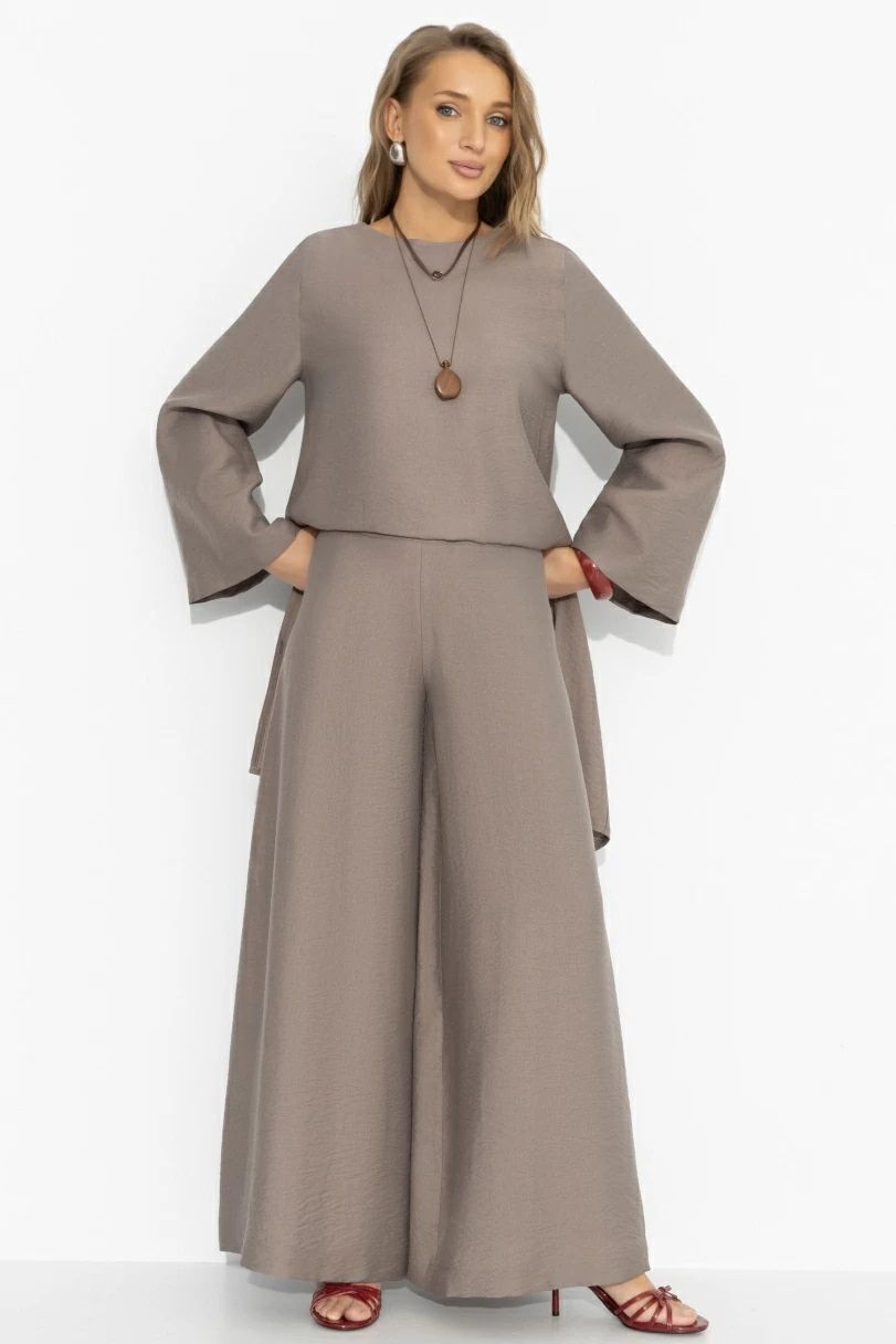 Брюки широкие коричневого цвета от компании Charutti. Высокая посадка собирает талию и держит осанку. Ткань мягко драпируется, создавая ощущение воздуха вокруг тела, но линия кроя остаётся чёткой и архитектурной. Расслабленность в движении, собранность в деталях – редкое сочетание, которое читается с первого взгляда.