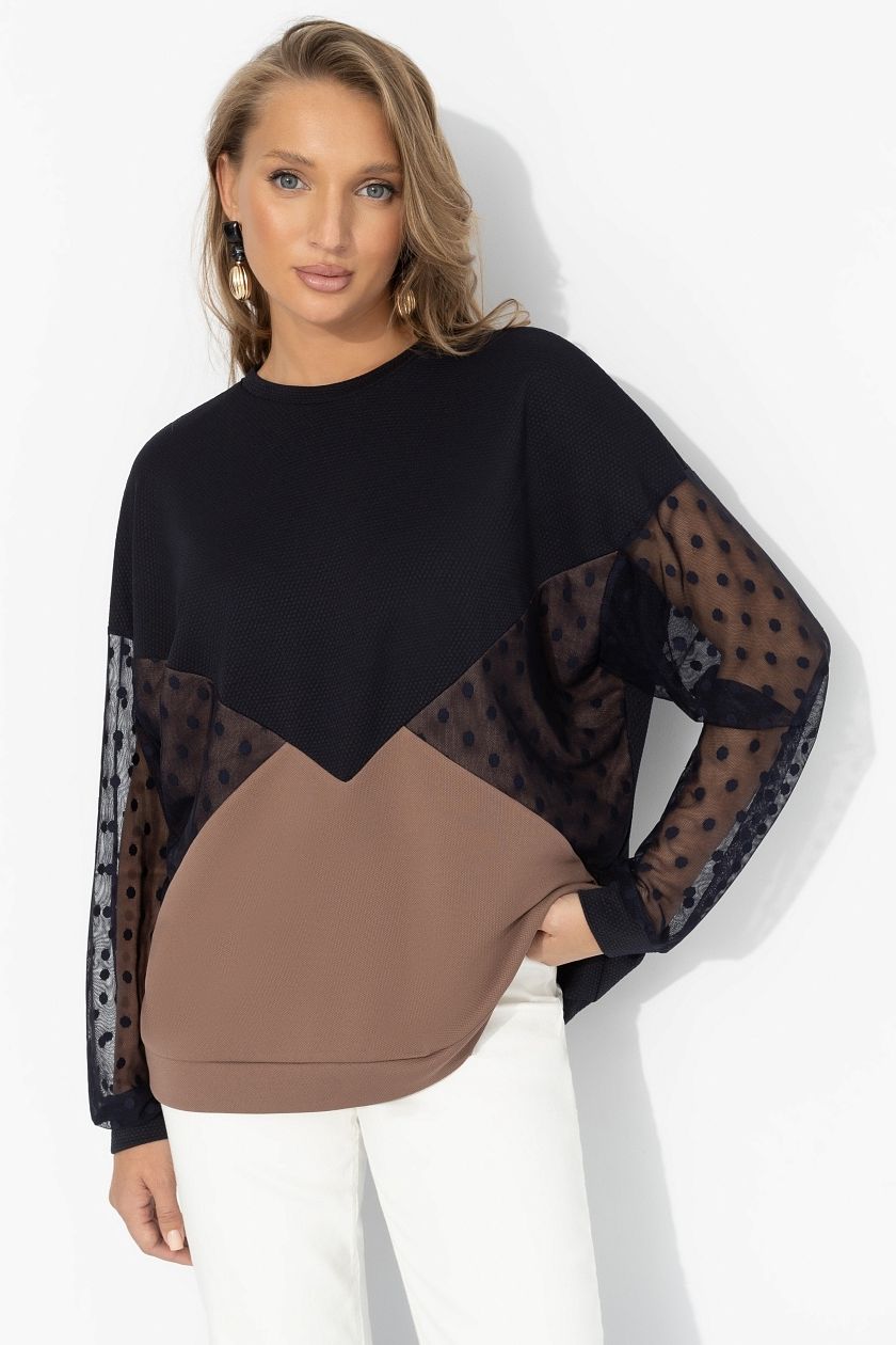 Свитшот дизайнерский с рукавами из сетки от компании Charutti. Модель свободного силуэта, круглый вырез горловины. Длинные втачные рукава, со спущенной линией плеча. Низ изделия и рукавов на притачных манжетах. Прекрасное решение для создания стильного образа.
