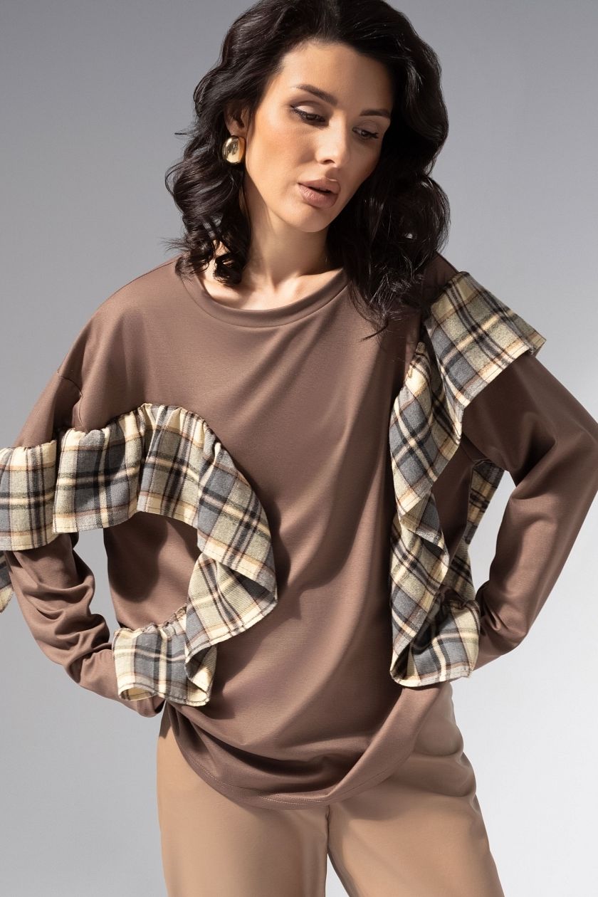 Лонгслив коричневый в стиле пэчворк от компании Charutti. Лонгслив свободного кроя, выполнен из трикотажного полотна. Круглый вырез горловины. Модель украшена элегантными объемными рюшами, которые создают выразительный акцент и подчеркивают женственный силуэт. Идеальный выбор для создания неповторимого образа.
