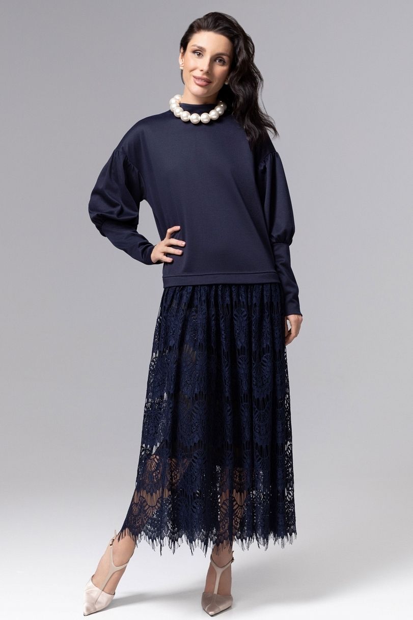 Платье комбинированное синее с кружевом